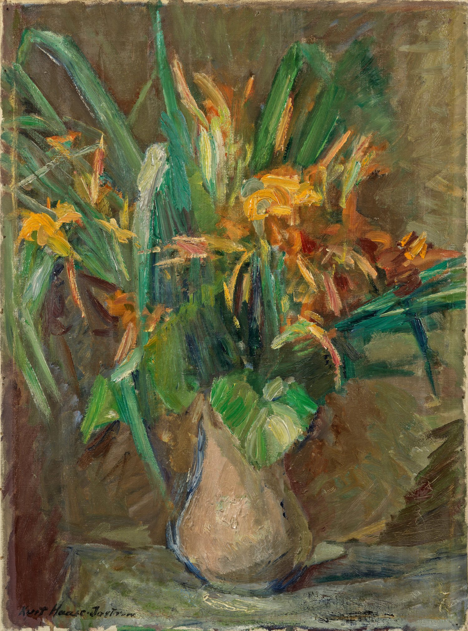Mit virtuos-pastosem Duktus gemaltes, expressionistisches Werk des Künstlers. Haase-Jastrow studierte ab 1903 in Berlin, ab 1906 an der Dresdener Akademie bei Eugen Bracht und Oskar Zwintscher. In den 1920er Jahren fand Haase-Jastrow zu einer expressionistischen Malweise, 1937-1944 gehörte er zur Ateliergemeinschaft Klosterstraße Berlin. Öl/Lwd.; L. u. sign.; 71 cm x 52 cm.