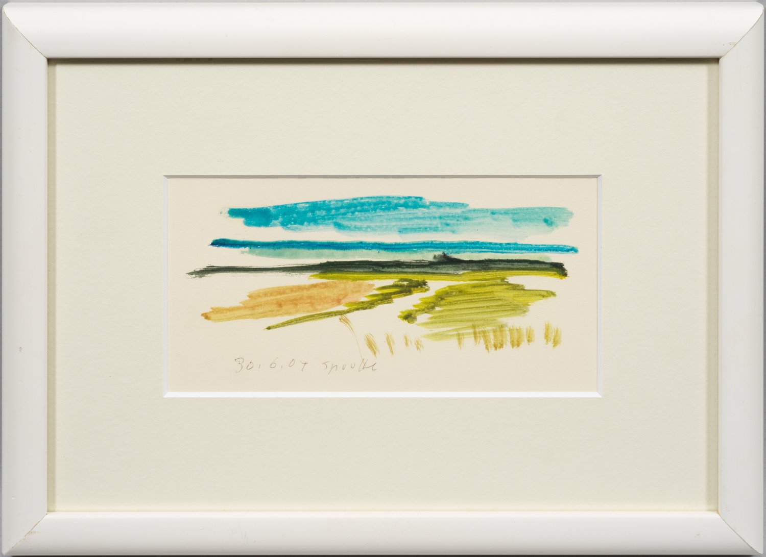 Dynamische, auf Grün, Blau und Beige reduzierte, gestisch angelegte Landschaftsimpression. Ab 1945 auf Sylt ansässig, malte Sprotte inspiriert durch die nordfriesische Landschaft, mit Vorliebe Strand- und Wellenmotive. Aquarell/Papier. L. u. sign. und dat. 30.6.(20)04. 9,5 cm x 19 cm. Rahmen.