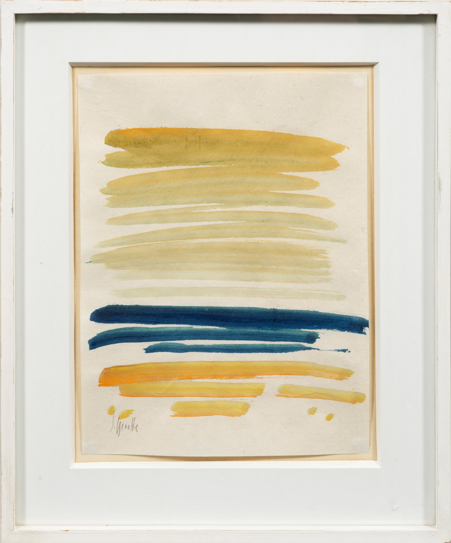 Schwungvoll ausgeführte, breite Farbspuren in Gelb und Blau. Gestisch abstrahierte, in Form und Farbe stark reduzierte Arbeit Sprottes, der bis 1938 u. a. bei Emil Orlik, Kurt Wehlte und Maximilian Klewer studierte und 1945 auf Sylt ansässig wurde. Inspiriert von der nordfriesischen Landschaft, schuf der Künstler mit Vorliebe Strand- und Wellenmotive. Aquarell/Papier. L. u. sign.; Auf der Rahmenabdeckung verso vom Künstler beschriftet mit Ortsangabe Kampen und Dat. 3.11.(19)70. Ca. 32,3 cm x 24,8 cm. Rahmen.