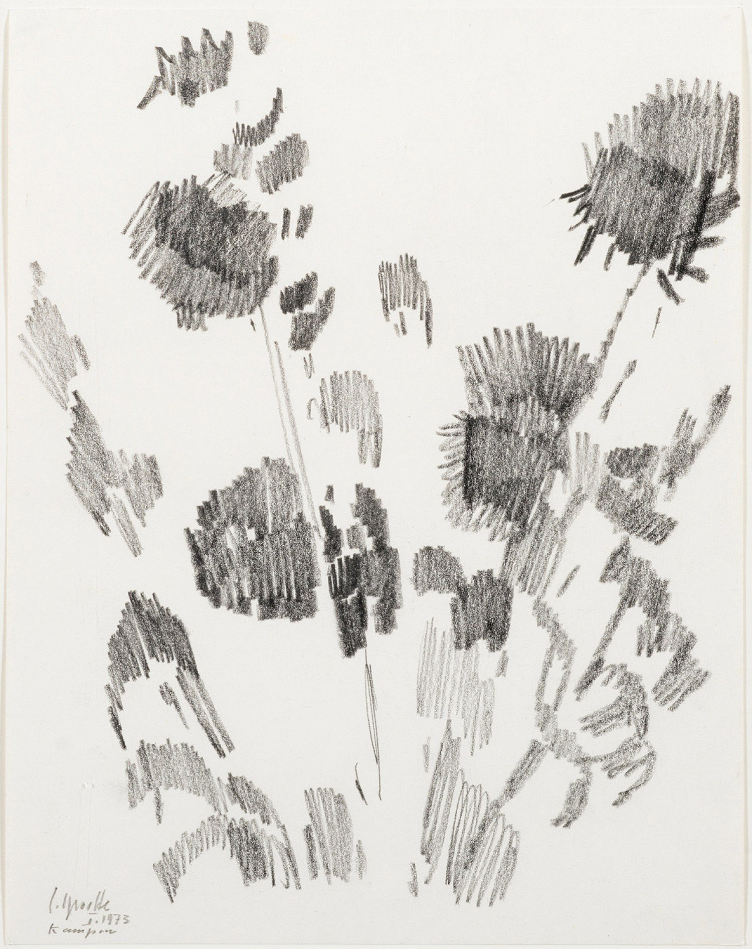 Reduzierte, der Abstraktion angenäherte Arbeit Sprottes, der 1945 auf Sylt ansässig wurde, wo er insbesondere von der nordfriesischen Landschaft inspirierte Pflanzen- und Strandmotive malte. Sprotte studierte bis 1938 u. a. bei Emil Orlik und Kurt Wehlte und war zudem Schüler Karl Hagemeisters, mit dem ihn auch eine Freundschaft verband. Nach realistischen Anfängen fand er nach dem Krieg zu starker Expressivität. Graphit/Papier. L. u. sign., dat. 1973 und ortsbezeichnet "Kampen". 30,5 cm x 24 cm. Rahmen (nicht geöffnet).