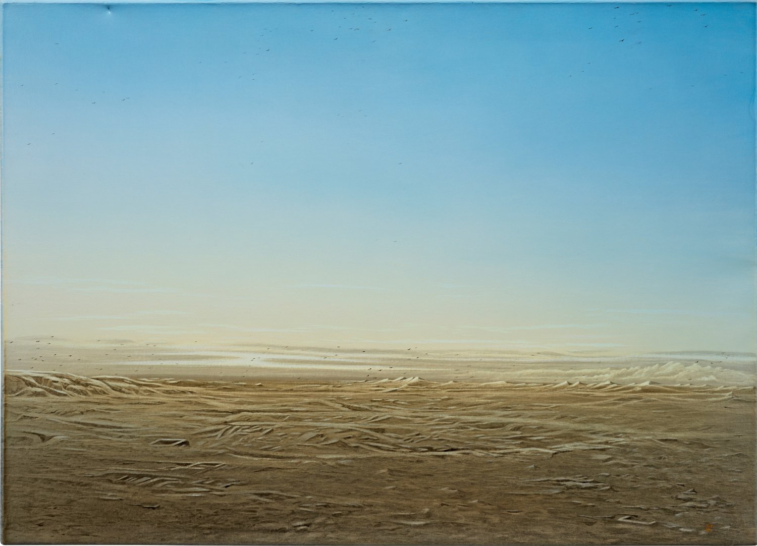Das Gemälde fasziniert durch den im großen Format gemalten leeren Raum, der zwar akademisch-realistisch, fast altmeisterlich gemalt ist, sich aber gleichzeitig der Einordnung entzieht. Auch der Titel "Scavo" (italienisch für Ausgrabungsstätte) und die Ortsangabe Agliano lassen der Interpretation großen Spielraum. Das Werk, das während eines längeren Italienaufenthalts des Künstlers 1991 entstand, zeigt offenbar eine wüstenartige öde Fläche, über die sich ein vom Gelblichen ins Blau übergehender Himmel spannt. Unzählige, erst bei genauem Hinsehen, erkennbare Rabenvögel fliegen durch die Luft. Die Ausführung in äußerst feinmalerischer Technik ist von der Neuen Sachlichkeit und den Malern des Phantastischen Realismus bekannt. Schimmelpenning studierte 1968 - 1974 an der Akademie der Bildenden Künste in München, er reiste viel und fand über Ausstellungen weitreichende Anerkennung. Heute lebt er wieder nahe der Nordseeküste, seiner alten Heimat, in Stade. Öl/feinen Nesselstoff. Verso sign., betitelt und datiert 1991. 93 cm x 130 cm.