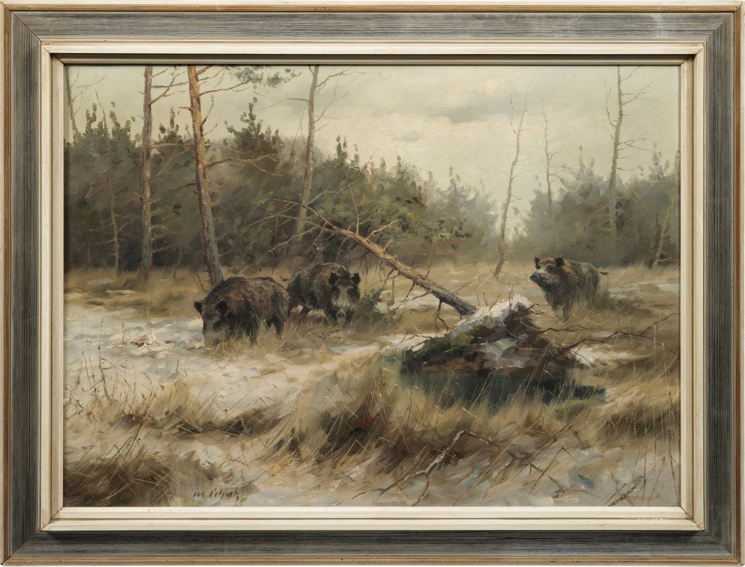 Naturalistisch aufgefasstes Waldmotiv des Künstlers, der vor allem Jagdtiere in ihrer natürlichen Umgebung präzise darstellte. Ausgebildet an der Hochschule für Bildende Künste in Berlin, erhielt Schatz ab 1964 eine Reihe von Auszeichnungen für seine Tierbilder. Öl/Lwd.; L. u. sign.; 60,5 cm x 80,5 cm. Rahmen.
