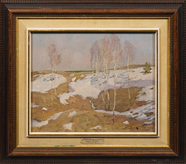 Impressionistische, in pastelltonigem Kolorit gemalte Landschaft in der Tradition von Isaac Ilyich Levitan. Pokulity studierte am Kunstinstitut in Kiew und schloss 1965 sein Studium ab. Später wurde er Mitglied der Akademie der Künstler der UdSSR, beteiligte sich an vielen Ausstellungen. Werke des Malers sind in nationalen und internationalen Museen und Privatsammlungen vertreten. Öl/Lwd.; R. u. in kyrillisch sign. u. dat. 1960. 44 cm x 50 cm. Original-Rahmen.