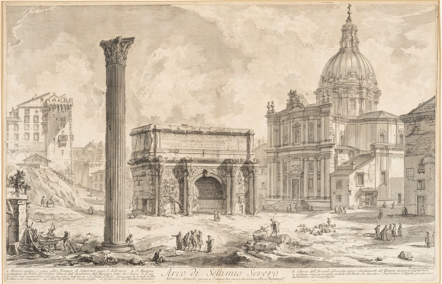 Radierung/Bütten, um 1759. Im Hintergrund Santa Maria in Araceli. Piranesis Radierungen dienten Romtouristen als Erinnerungsstücke an die Ewige Stadt. In der Platte bez.; Stark gebräunt. Plattenmaße 37,5 cm x 58,5 cm. Rahmen.