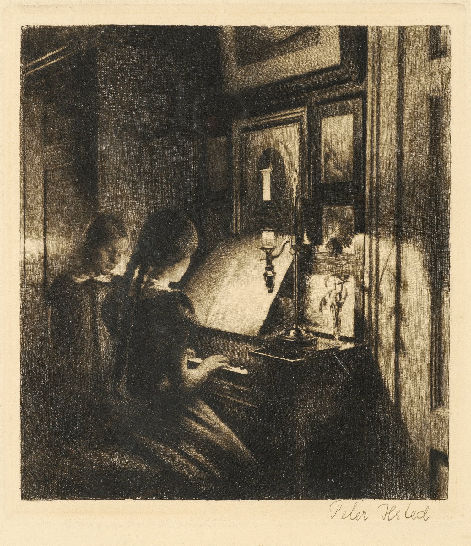 Mezzotinto/Papier. Handsigniert. Die kleinformatige Darstellung des, für seine Interieurbilder in Malerei und Druckgrafik bekannten Künstlers, zeichnet sich durch die meisterhafte Hell-Dunkel-Modulation in der schwierigen Mezzotinto-Technik aus. Darstellungsmaß 21,4 cm x 19,5 cm. Rahmen.