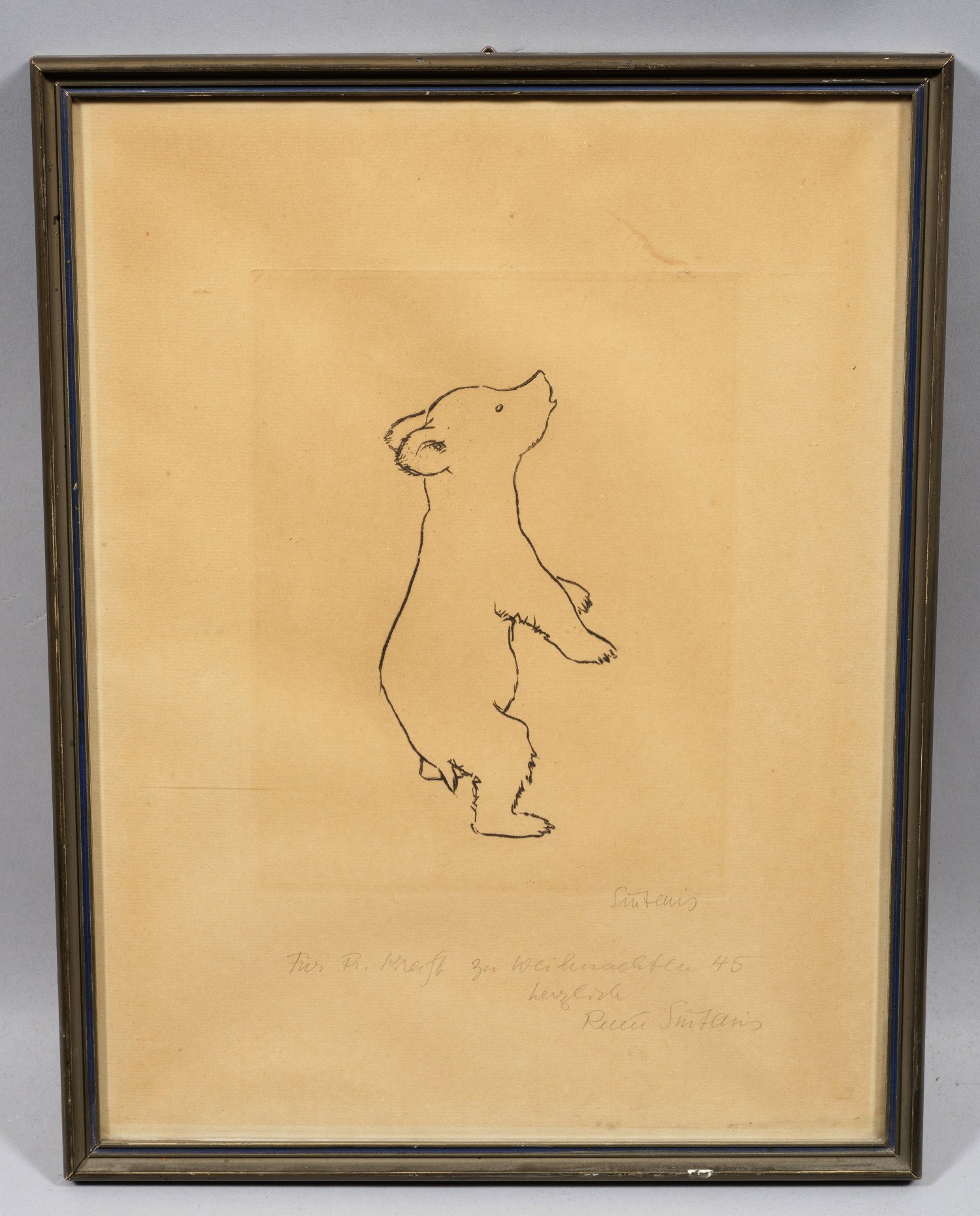 Radierung/Papier. Sign. sowie mit persönlicher Widmung. Motiv erschienen in der Mappe "Junge Tiere" im Verlag Dr. Ernst Hauswedell & Co., Hamburg 1948. Plattenmaß 22,1 cm x 16,5 cm. Blatt ca. 38 cm x 29 cm. Rahmen.