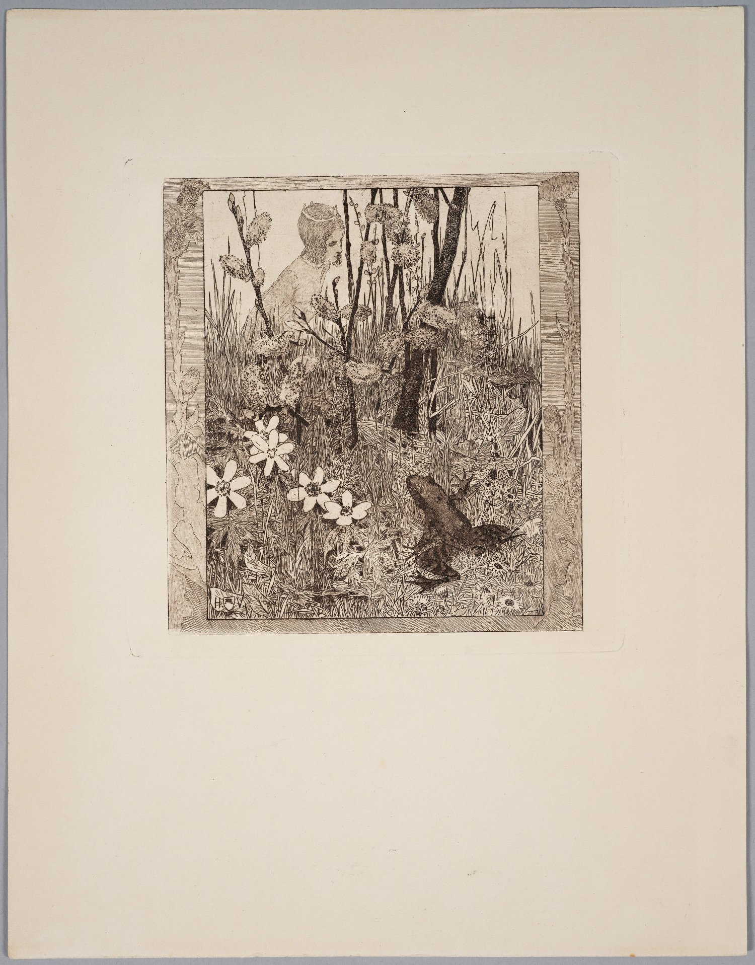 Sechs Radierungen/Velin. 5 Bll. in der Platte sign. bzw. monogr.; Mappe mit sechs Originalradierungen und begleitendem Text von Erna Regina Löwenwarter, erschienen bei Carl Frye & Sohn, Münster, 1924. Dabei: Tod und Alte (Rief 11), Am Quell (Rief 1), Die Schlangenbraut (Rief 4), Die Hirtin (Rief 9), Froschbraut (Rief 28), Die sieben Raben (Rief 15). Blattmaße 29,9 cm x 23,4 cm.