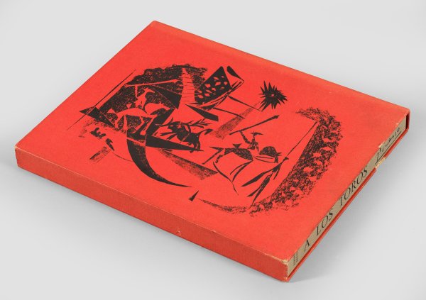 Hrsg. André Sauret, Monte-Carlo 1961. Künstlerbuch mit vier eingebundenen Lithographien (gedruckt bei Mourlot Frères), Reproduktionen der 103 Tuschezeichnungen mit Stierkampfszenen, die Picasso im Dezember 1960 in der Galerie Louise Leiris ausstellte, und Text von Jaime Sabartés (franz. Ausgabe). Geprägter Leinenband in illustriertem Original-Papp-Schuber. Wvz. Bloch/Livres 108; Bloch 1014-1017. 33 cm x 26 cm x 3 cm.