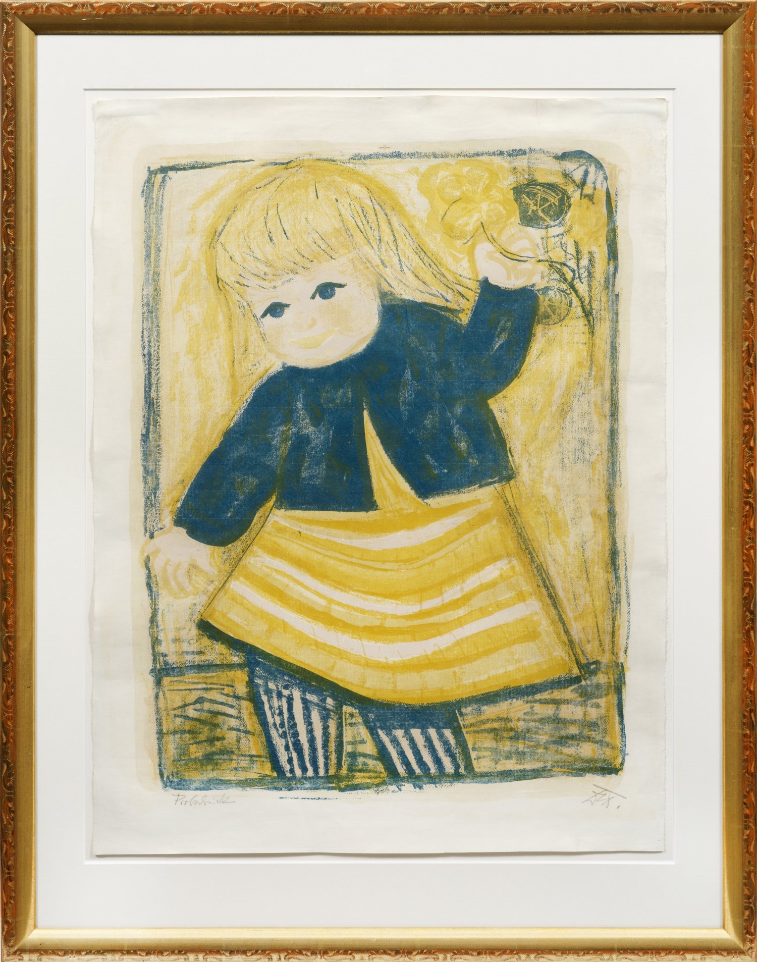 Farblithographie/Maschinenbütten, 1953. Sign. u. bez. "Probedruck". Abzug außerhalb der Auflage von 60 nummerierten Exemplaren. Wvz. Karsch 204 II. Das von hellen Blau- und Gelbtönen dominierte Blatt mit der Darstellung seiner fröhlichen, im Garten stehenden, jungen Enkelin Bettina (geb. 1949) ist zweifellos eine der schönsten Grafiken des Künstlers nach 1945, als er zu einer erneuten, befreiten Expressivität und einem frisch leuchtenden Kolorit fand. Im breiten Blattrand geglättete Knickspuren und einige restaurierte, geringfügige Randeinrisse. Darstellung ca. 63,5 cm x 47,5 cm; Blatt ca. 72 cm x 53,5 cm. Rahmen.