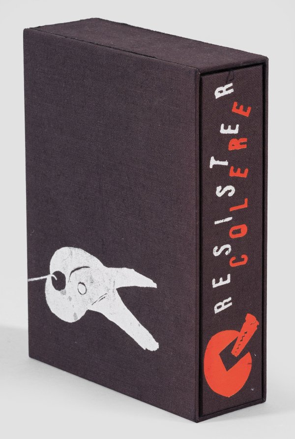 Portfolio with 44 unbound, partly double-sided lithographs by Arman with selected poems in French by Tita Reut. Numbered 69/100 and signed by Arman and Tita Reut in the colophon. Published in a total edition of 125 copies by Atelier Franck Bordas, Paris 2001. Black linen cover with embossed, illustrated linen slipcase.