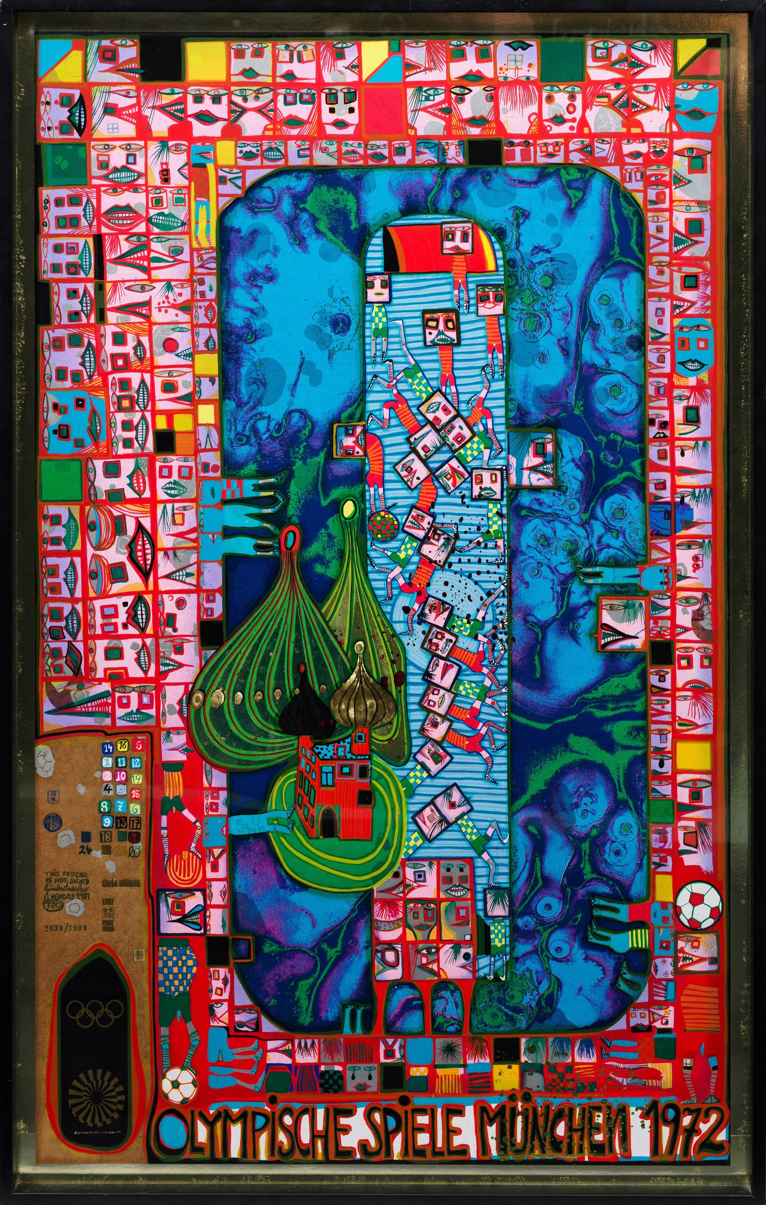 Farbserigraphie mit Metallprägung/festes braunes Packpapier, 1971. Stempelnummerierung 2039/3999. L. u. geprägte, japanische Inkan-Stempel, Prägestempel "This poster is not signed Hundertwasser Lengmoos 1971. 700" sowie 3 Prägestempel von Druckern und dem Verleger. Originalposter. Herausgegeben von der Edition Olympia 1972 GmbH, München 1971. Gedruckt bei Dietz Offizin, Lengmoos. Metallprägung bei Kurz Prägefolien. Werknr. 700. Wvz. Koschatzky 54; Wvz. Fürst HWG 54. Darstellung 102,5 cm x 64,3 cm. Blatt ca. 106 cm x 67,8 cm. Rahmen.