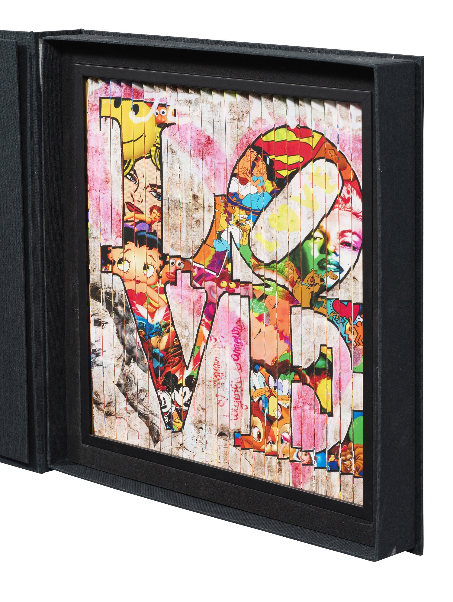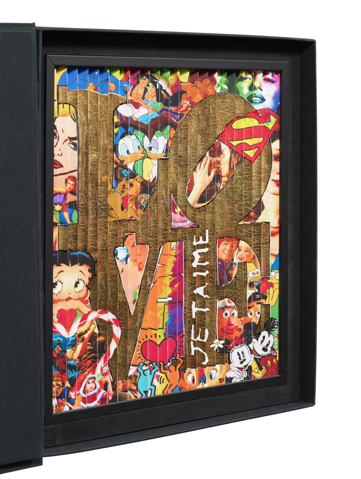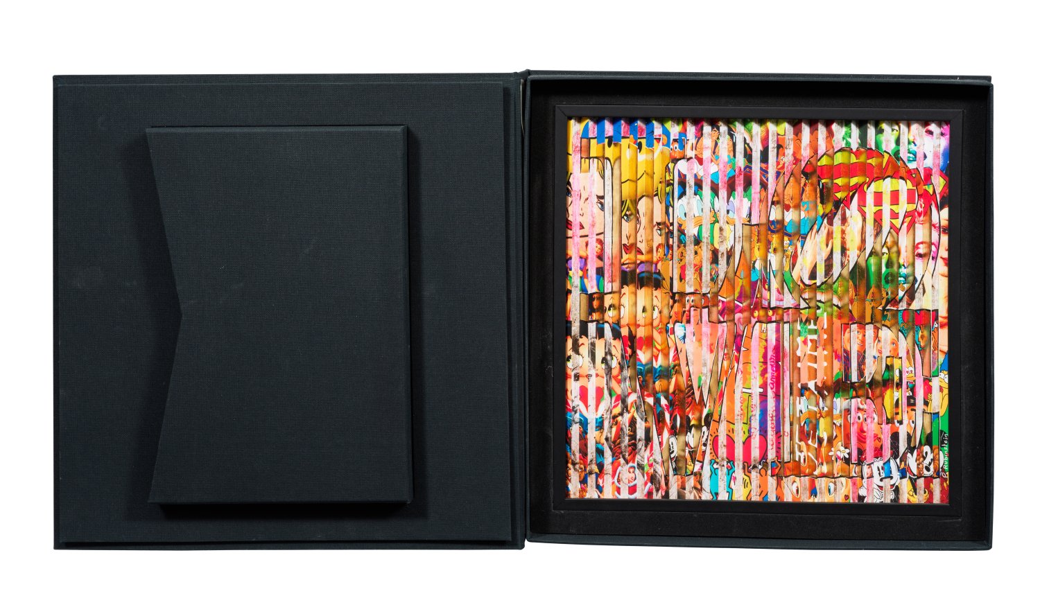 Kinetic PopArt Grafik. Bild im Bild Motiv. Zwei Collagenbilder, die sich aufgrund der Falttechnik im Vorbeigehen abwechseln, was an eine bewegte Reklametafel erinnert. Dazu stoffbezogene Kassette. Tintenstrahldruck mit Vergoldung/Karton beschichtet. U. re. sign. im Druck sowie rückseitig per Hand mit Aufl. X (10)/L (50).; Begleitbuch fehlt. 35 cm x 35 cm x 2,5 cm.