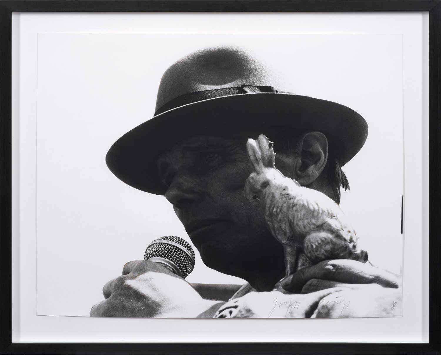 Gelatinesilberabzug/Fotopapier, 1982. R. u. von Beuys und Zoa (Pseudonym der Fotografin Brigitte Müller-Fehn) sign.; Verso Etikett der Fotografin. Erschienen in "Photo-Editionen 1982" außerhalb der Auflage von 33 nummerierten Expl. bei der Galerie Holtmann, Köln, 1982-1983. Wvz. Schellmann 404. Blatt ca. 50,6 cm x 61 cm. Rahmen.