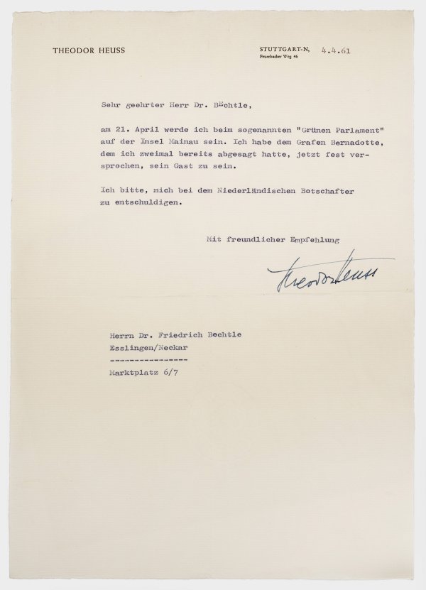 5 maschinenschriftliche Briefe mit Unterschrift 1961-1963, zumeist Büttenpapier mit Wasserzeichen, 4°-/5°-Format, 1x gelocht. Danksagungskarte mit Unterschrift, handschriftlicher Notiz und von fremder Hand mit Bleistift dat., 6°-Format. In diesen Schreiben bezieht sich Heuss auf Einladungen Bechtles zu politischen und diplomatischen Veranstaltungen, deren Teilnahme er ab- bzw. zusagt. Minim. Alters- und Gebrauchsspuren, minim. Knickspuren.