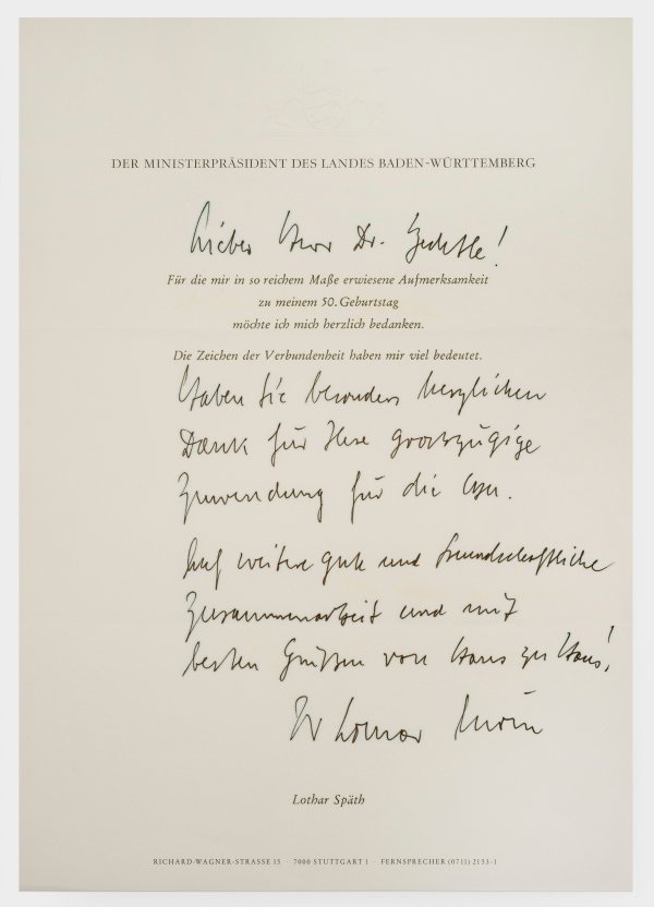 Enthält: Hans Filbinger (MP Ba-Wü 1966-1979): 10 Br., 7 Karten 1966-2000; Kurt Georg Kiesinger (MP Ba-Wü 1958-1966, Bundeskanzler 1966-69): 3 Br., 15 Karten (teilw. mit Umschlägen) 1963-1972; Dr. Reinhold Maier (MP Württemberg-Baden 1949-1952, 1952-53 MP Ba-Wü.): 1 Br., 1 Karte 1968, o.J. ; Gebhard Müller (MP Ba-Wü. 1953-58): 35 Br. (1x Antwortdurchschlag), 29 Karten, 1960-90; Manfred Rommel, Oberbürgermeister Stuttgart (1975-1996: 2 Br. Inkl. 1 e. Geländeplan 1986-1992; Lothar Späth (MP Ba-Wü. 1978-1991): 5 Br., 3 Karten 1978-88, Erwin Teufel (MP Ba-Wü. 1991-2005): 12 Br., 4 Karten 1987-98.