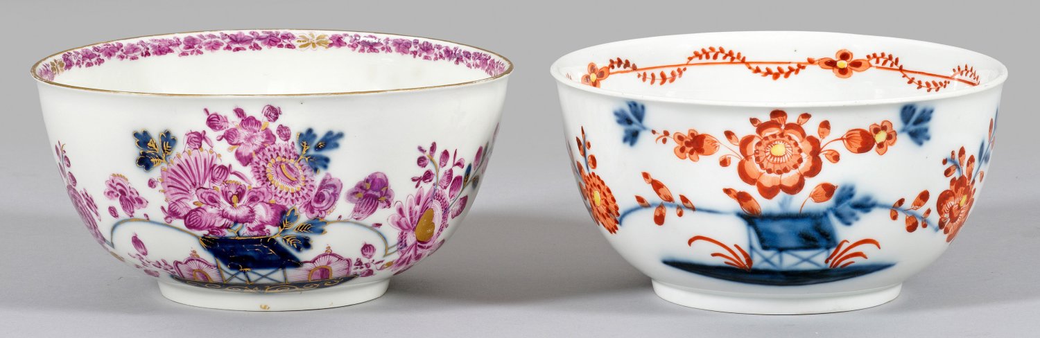 Runder, leicht gebauchter Korpus mit leicht ausschwingendem Rand. Auf der Schauseite sog. "Tischchenmuster" mit emporwachsenden Chrysanthemen- und Päonienblüten, rückseitig asiatische Vase mit Blumenzweigen. Unterglasurblaue und polychrome Malerei. Teilw. goldgehöht und staffiert. Innen umlaufende Blütenbordüre. Einmal mit Blaumalerzeichen "B". Unw. rest.; Schwertermarke. D. 16 cm - 17 cm.