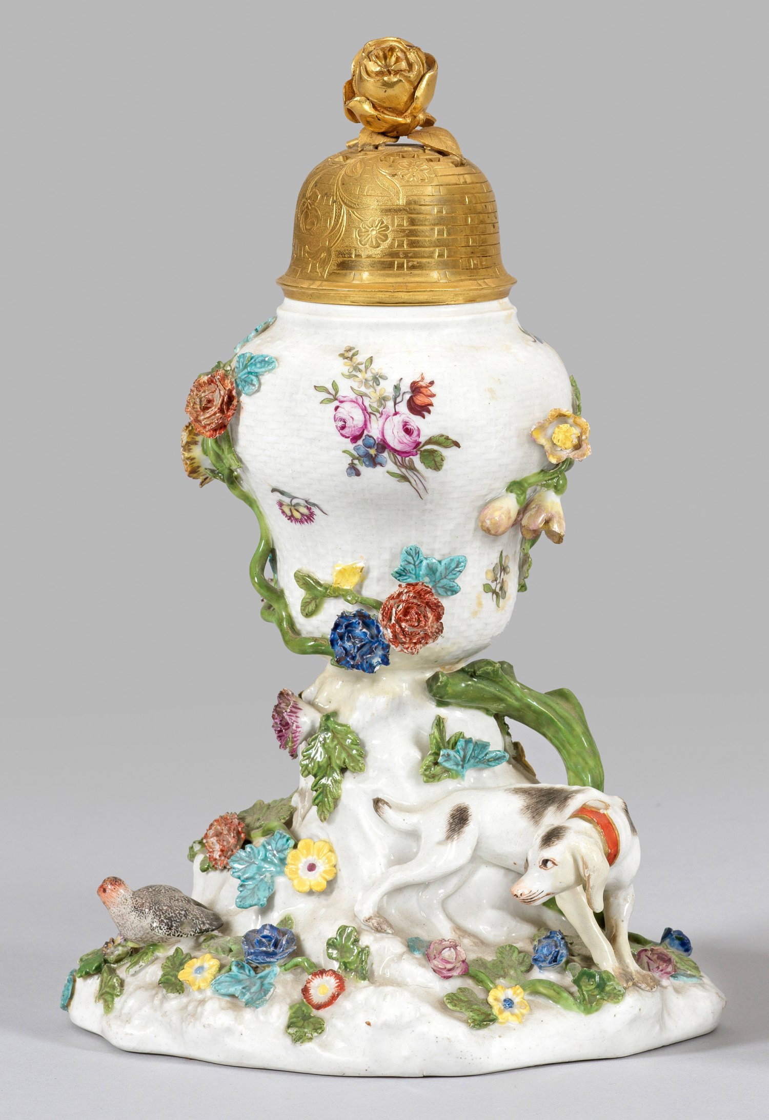 Felsiger, mit Blättern und Blüten belegter, aufsteigender Sockel mit sitzenden Fasanenhennen und sich anschleichendem Jagdhund als Träger für eine balusterförmige Vase. Aufgewölbter, durchbrochen gearbeiteter Bronzedeckel, mittig ein plastischer Rosenknauf. Beidseitig der Wandung von emporwachsenden, feinmodellierten Blütenranken umzogene Blütengebinde und Einzelblüten in polychromer Malerei. Entw. Johann Gottlieb Ehder, um 1747. Erg. Bronzedeckel. Rest.; Minim. best.; Haarriss. Schwertermarke. Ges.-H. 23,5 cm.