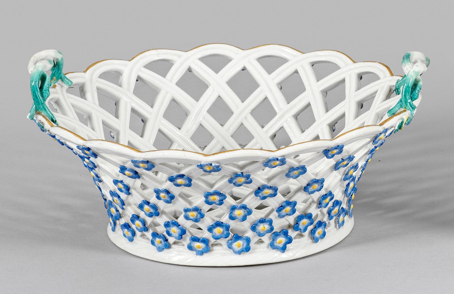 Ovale, weit ausschwingende Form. Korbflechtartig durchbrochen gearbeitete Wandung, in den Schnittpunkten aufgelegte Vergissmeinnicht-Blüten. Seitlich ansetzende, geflochtene Asthenkel, in kleinen plastischen Blüten endend. Polychrome Malerei mit Goldstaffage. Partiell best.; Ger. Brandrisse. Schwertermarke. H. 10 cm. B. 22 cm.