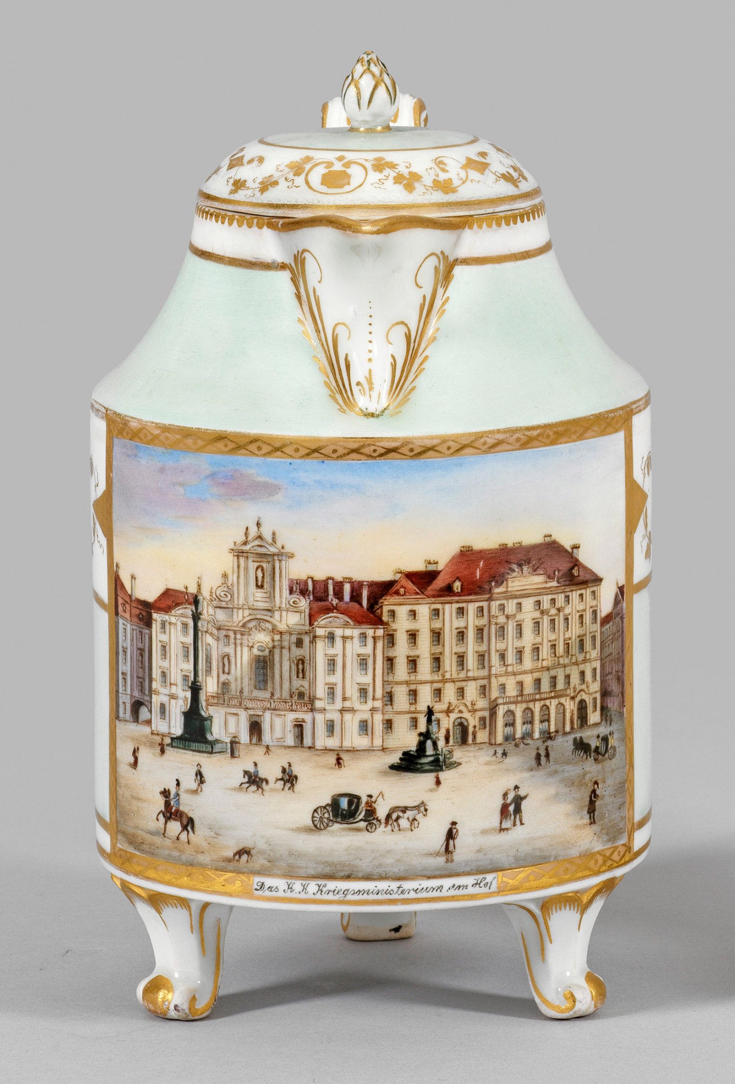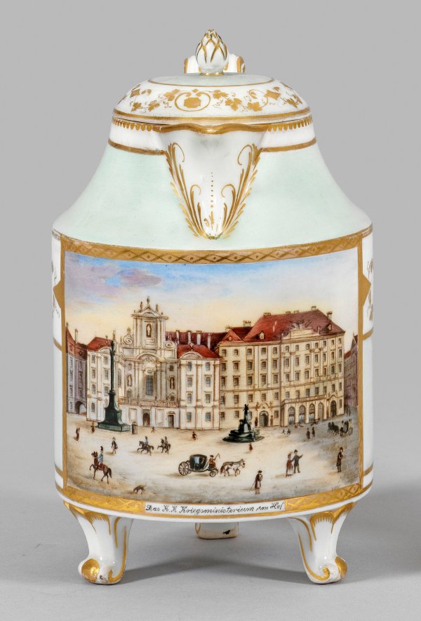 Auf drei vegetabilen Füßchen stehender Korpus mit eingezogener Schulter. Seitlich hochgezogener Henkel mit reliefplastischem Akanthus. Leicht aufgewölbter Deckel mit Pinienknauf. Lindgrüner Fond. Schauseitig der Wandung in goldradiertem Rechtecksfeld die Ansicht des Kriegsministeriums am Hof. Rücks. und auf dem Deckel schmales, in Weiß ausgespartes Band mit ornamentalem Golddekor und Weinlaub. Feine polychrome Malerei mit Goldstaffage. Malerei der Vedute wohl Anfang 20. Jh.; Jahreszeichen. Minim. best./rest.; Manufakturmarke. H. 17 cm.