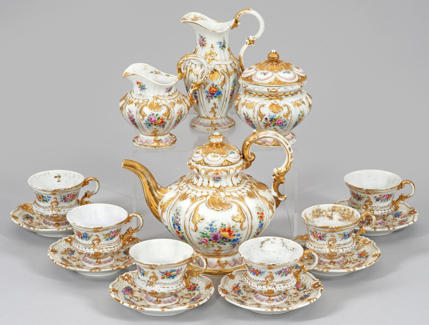 für 6 Personen. 10-tlg.; Kanne, Sahnegießer, Zuckerdose, 6 Tassen mit Untertassen und Gießer. Kannelierte Wandung. Allseits muschelförmiger und floraler Reliefdekor mit farbenprächtigen Blumenbuketts und Blüten. Rosafarbener Teilfond. Polychrome Malerei mit reicher Goldstaffage. Ber.; Rest.; Schwertermarke. Kannen-H. 21,5 cm. Tassen-H. 7,5 cm - 8 cm.
