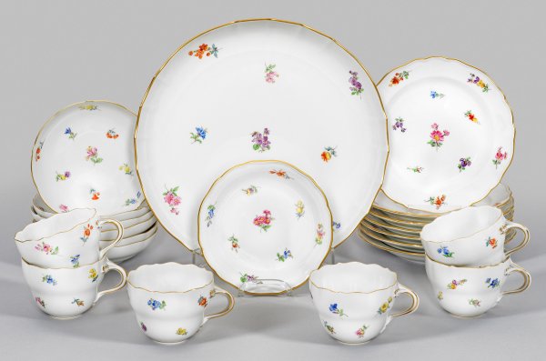 15-tlg.; 6 Kaffeetassen mit Untertassen, 7 Dessertteller, Konfektschälchen und Anbietschale. Form "Neuer Ausschnitt". Allseits Streublumendekor in polychromer Malerei mit Goldrand. Schwertermarke. Tassen-H. 6,5 cm. Anbietschalen-D. 28,5 cm.