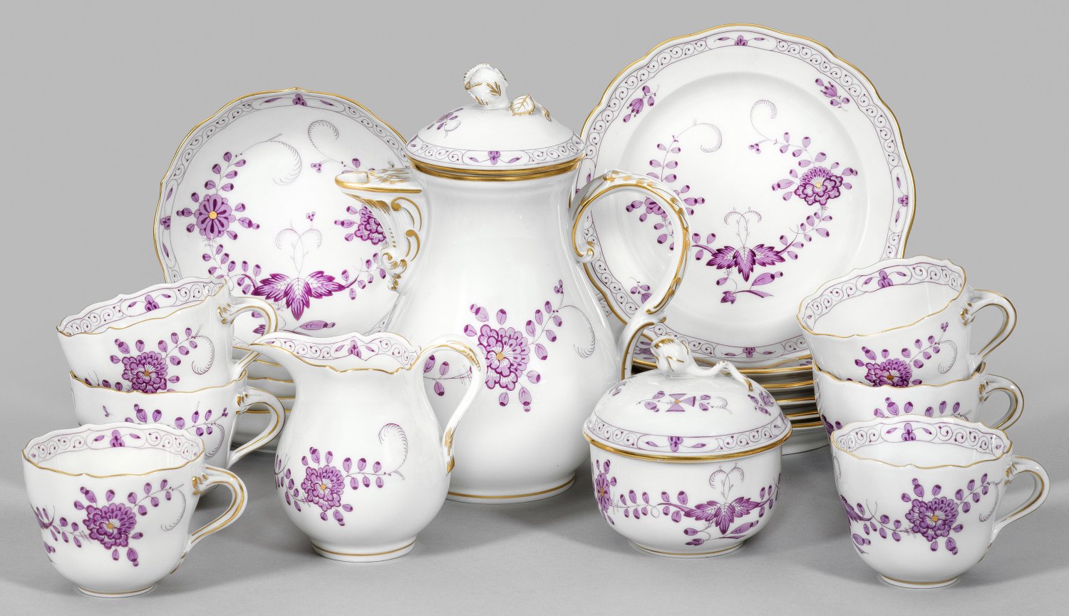 für 6 Personen. 15-tlg.; Form "Neuer Ausschnitt". Mokkakanne, Sahnegießer, Zuckerdose, 6 Mokkatassen mit Untertassen und 6 Dessertteller. Indianischer Blumendekor in purpurfarbener, goldgehöhter Camaieumalerei. Goldrand. Partiell minim. best.; Schwertermarke. Kannen-H. 17 cm.
