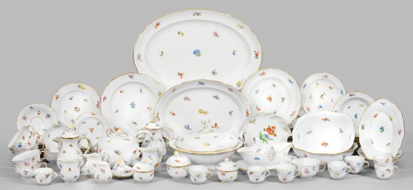 74-tlg.; Teekanne, 7 Teetassen mit 6 Untertassen, 6 Dessertteller, Blattschale (mit Blumendekor), Sauciere, 2 verschieden große Anbietplatten, Deckelterrine, 4 Sahnegießer (eines davon mit Reliefdekor), 3 Zuckerdosen, 8 Mokkatassen mit 5 Untertassen, 2 Mokkakannen, 2 längsovale Anbietschalen, 6 Suppenteller, 7 Kuchenteller, 5 flache Speiseteller, 17 weitere Dessertteller, 1 Rundschälchen. Allseits Streublumendekor in polychromer Malerei mit Goldrand. Wenige minim. best.; Schwertermarke. Größte Anbietplatte 50 cm x 35,5 cm. Teekannen-H. 14,5 cm.