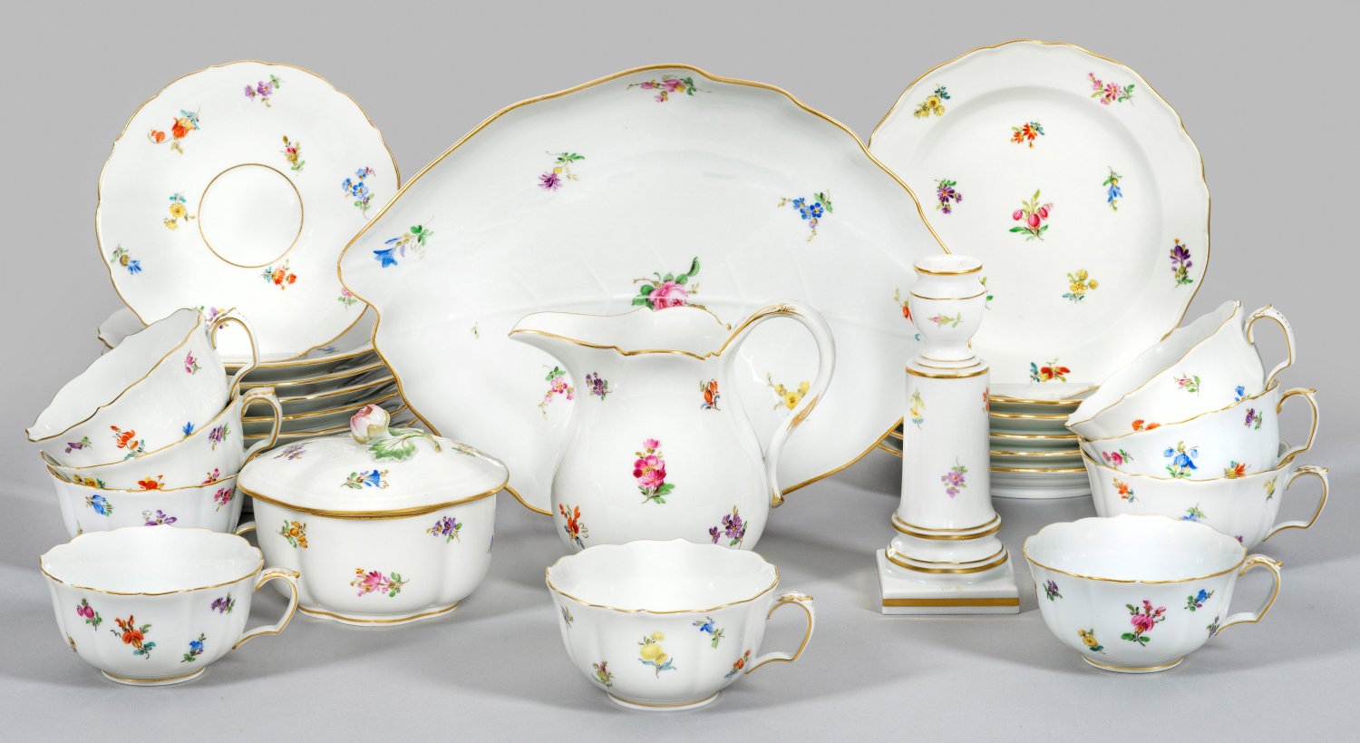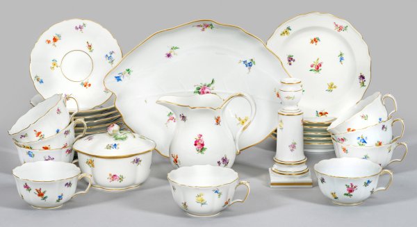 19-tlg.; 9 Teetassen mit Untertassen, 6 Dessertteller, großer Sahnegießer, vierpassige Zuckerdose, Kerzenleuchter und große Blattschale. Form "Neuer Ausschnitt". Allseits Streublumendekor in polychromer Malerei mit Goldrand. Partiell best./ber.; Ger. Haarrisse. Schwertermarke. Tassen-H. 5 cm - 5,5 cm. Blattschale 30 cm x 21,5 cm.