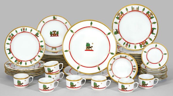 41-tlg.; 2 Platz-, 12 Speise-, 12 Dessert-, 6 Suppenteller, 8 Teetassen mit Untertassen, Obstschale. Runde Grundform. Dekor mit Häusern, Papageien, Panthern und Hunden zwischen in Form geschnittenen Büschen in Grün, Rot, Schwarz und Gold. Im Goldrand mehrmals das Firmenzeichen. Rückseitig bez. "La Maison de Louis Cartier, Made in France, Limoges, 1986". Teilw. mit Original-Kartons. 2 Objekte rest.; 2 mit Haarriss. Firmenmarke. D. 8 cm – 26,5 cm.