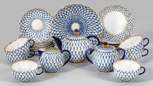 für 6 Personen. 16-tlg.; Teekanne, Sahnegießer, Zuckerdose, 6 Teetassen mit Untertassen, 6 kleine Dessertteller und Anbietschale. Form "Tulpe". Dekor "Kobaltnetz". Flächendeckender Netzdekor in unterglasurblauer, goldgehöhter Malerei. Dekor-Entw. Serafina Jakowlewa. Goldornamentbordüre. Gestempelte Manufakturmarke mit Bez. "Made in USSR". Kannen-H. 14 cm. Teller-D. 15 cm. Tassen-H. 6 cm.