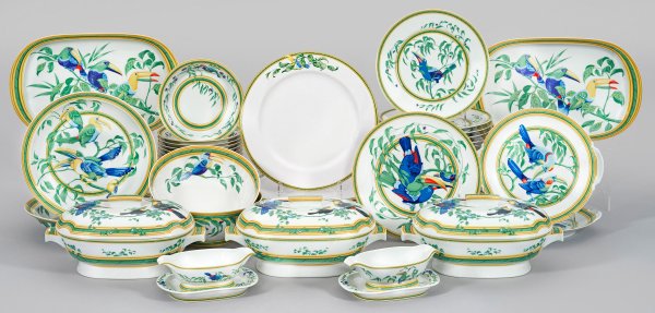 65-tlg.; 20 Speise-, 19 Salat-, 13 Platzteller, 2 Henkel-, 2 Bratenplatten, 2 Beilagen-, 2 Salatschalen, 2 Saucieren mit Untertellern, 3 Terrinen. Farbenprächtiger Dekor mit Tukanen. Bez. "HERMÈS". 12 der Platzteller abweichend aus Fayence mit Dekor "Moustiers". Gebrauchsspuren. 3 Objekte minim. best., 1 mit Haarriss, 1 rest.; Firmen- und Manufakturmarke. Bratenplatten 38 cm x 24 cm.