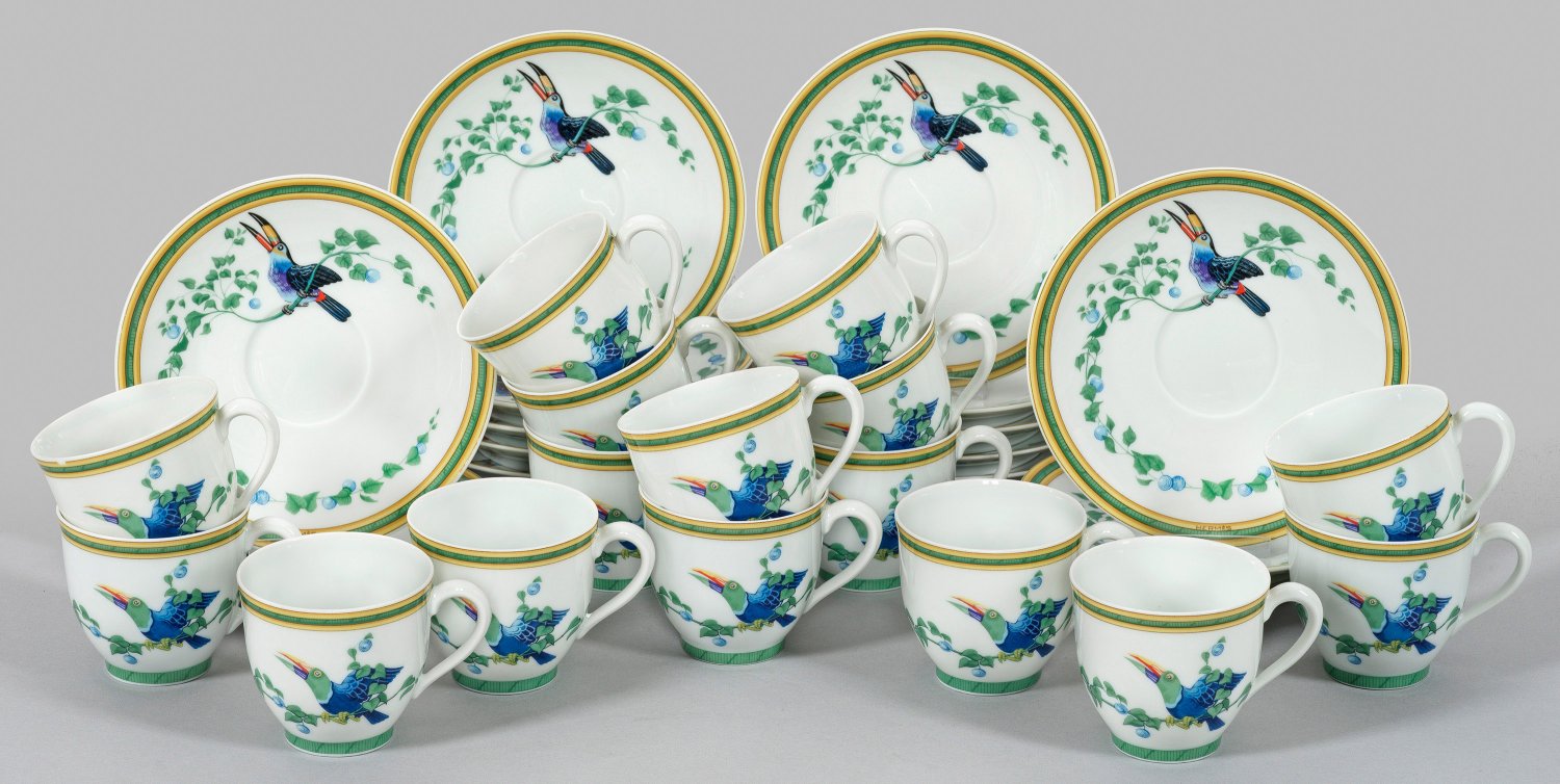 mit 15 Untertassen. Farbenprächtiger Dekor mit Tukanen. Bez. "HERMÈS". Teilw. minim ber.; 1 Tasse minim. best.; Firmen- und Manufakturmarke. Tassen-H. 6 cm. D. 6,5 cm - 13,5 cm.