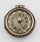 Silber. Übergehäuse mit flächendeckendem Fond aus Schildpatt sowie aufwändigem ornamental punziertem Dekor aus Volutenspangen. Rundes, glattes, verglastes Innengehäuse, gest. W47. Aufwändig reliefiertes, sog. Champlevé-Zifferblatt mit geschwärzten, römischen Zahlen und arabischer Minuterie, bez. Johann KornMan. Lanzenzeiger. Reich verziertes, vergoldetes Werk mit Spindelgang, Schnecke und Kette, durchbrochen gearbeiteten Pfeilern aus gegeneinander gestellten Voluten. Filigran ausgeschnittener Spindelkloben mit Maskaron sowie fein gravierten Blattvoluten und Vögeln. Platine bez. Johann KornMann. D. 5,4 cm. Ges.- Gew. ca. 118 g.