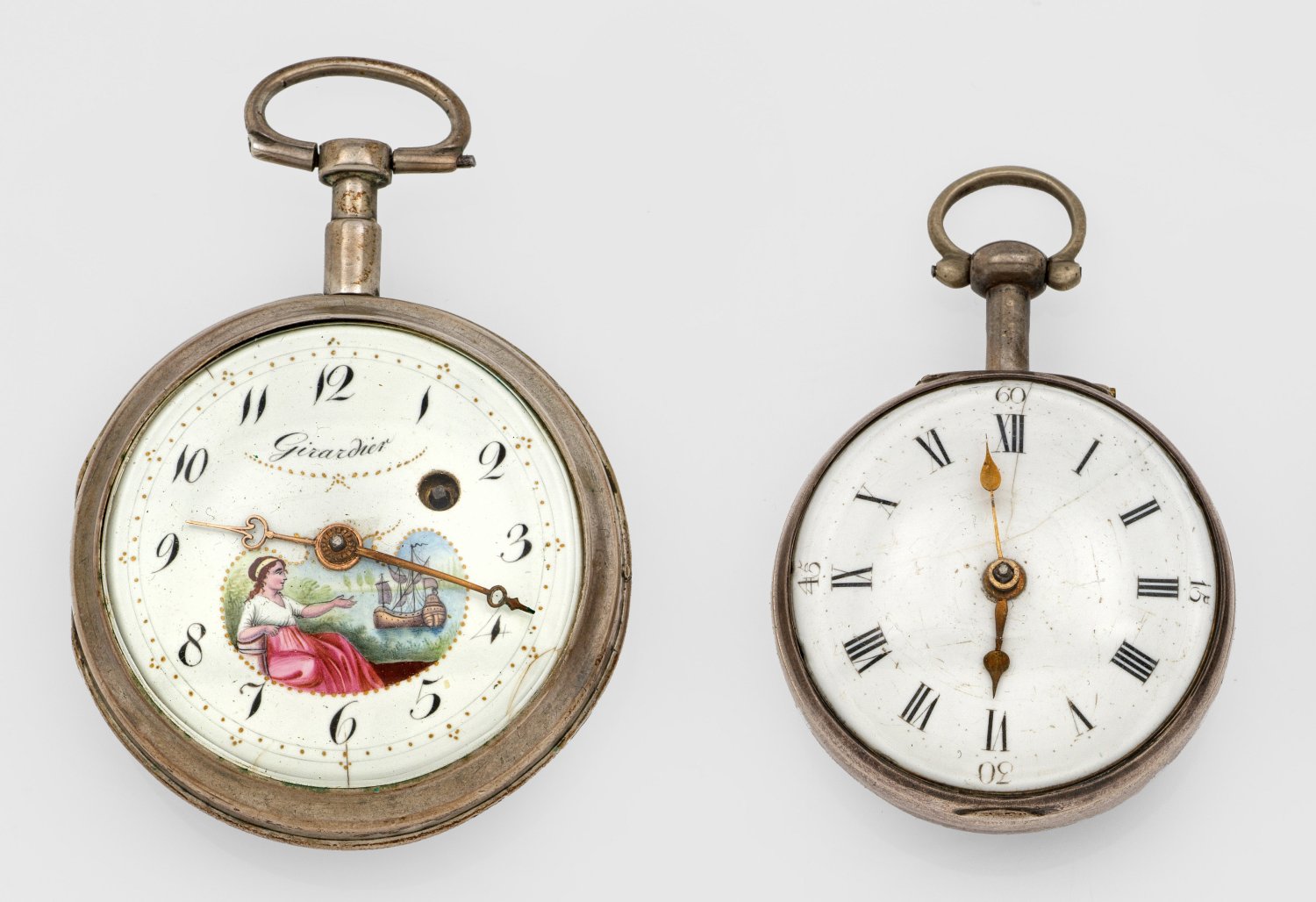 Schweiz, bzw. England, 19. Jh.; Silber. Glattes Uhrengehäuse. Weißes, teilw. figurativ staffiertes Emailzifferblatt mit arabischen Stab-Indexen bzw. mit vergoldeten Birnen- und Breguetzeigern. Mechanisches Werk mit Schlüsselaufzug. Herstellermarke "Girardier" und eine Platine sign. "John Howard, London" und nummeriert 1631. D. 42 bis 51 mm. Ges.-Gew. ca. 158,87 g.