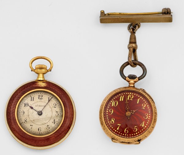 Schweiz, Ende 19. Jh. Gelbgold, gest. 585. Guillochiertes Uhrengehäuse, bzw. figürliche Email-Darstellung und Zifferblätter, arabische Indexe mit Birnen, bzw. Louis XV-Zeigern. Plexiglas (mit Riss). Mechanische Werke mit Kronenaufzug. D. 31 mm, bzw. 25 mm. Ges.-Gew. ca. 39,72 g.
