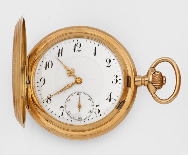 A hunting case pocket by Dürrstein & Co, in 14 k gold. Metal dome, mechanical movement. Manufacturer's Mark.