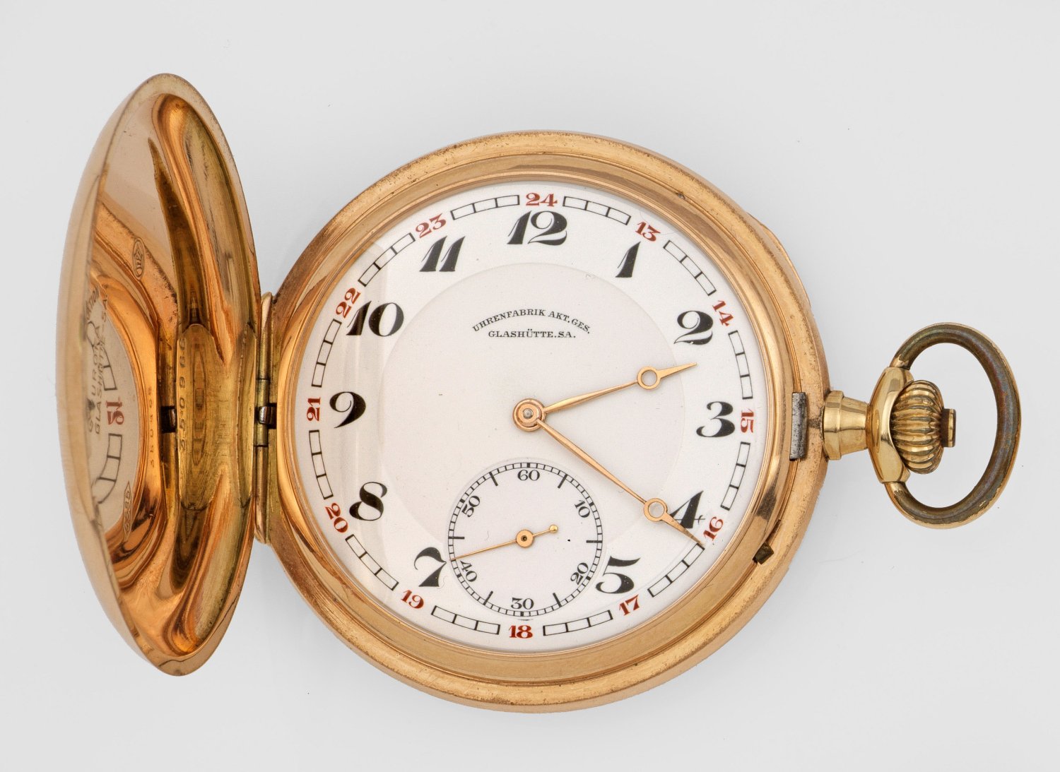 A hunting case pocket watch by Glashütte, circa 1925. Case and dome in 14 k red gold. Mechanical movement with crown wind. Manufacturer's mark. Original leather case.