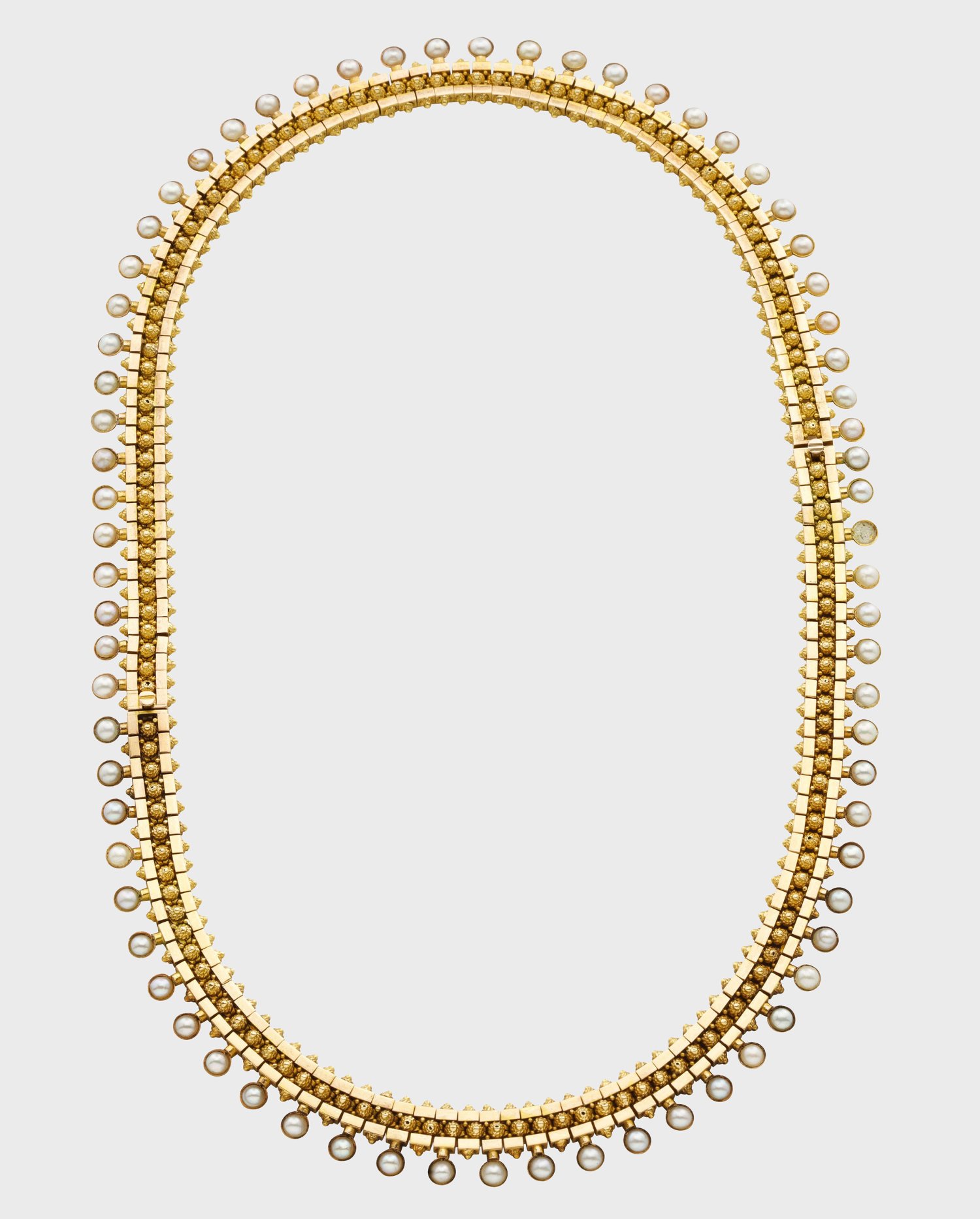 Um 1900. Gelbgold, 14 k. Ornamentierte Glieder, besetzt mit cremefarbenen Perlchen (1 Perle fehlt). Gew. ca. 32,34 g.