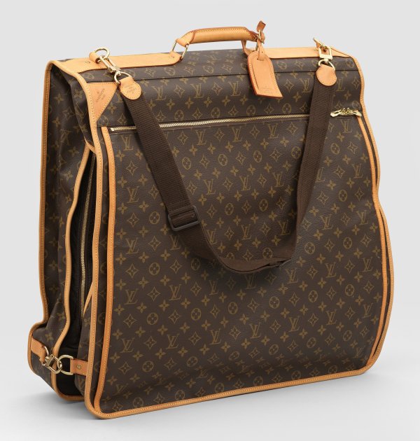 Monogram-Canvas und helles Leder mit gelben Nähten. Flacher, weicher, faltbarer Korpus mit Reißverschluss und Griff sowie flachem Außenfach. Abnehmbarer Schultergurt. Fünf Kleiderbügel. Herstellerzeichen. Date-Code SP0031. Ohne Schloss und Schlüssel. H. 100 cm.