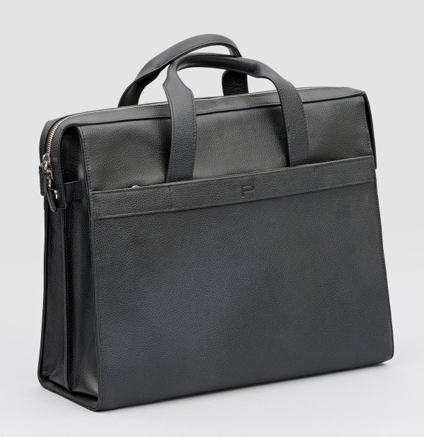 A black leather briefcase by Porsche Design. New condition. Original dust bag. Manufacturer's mark.