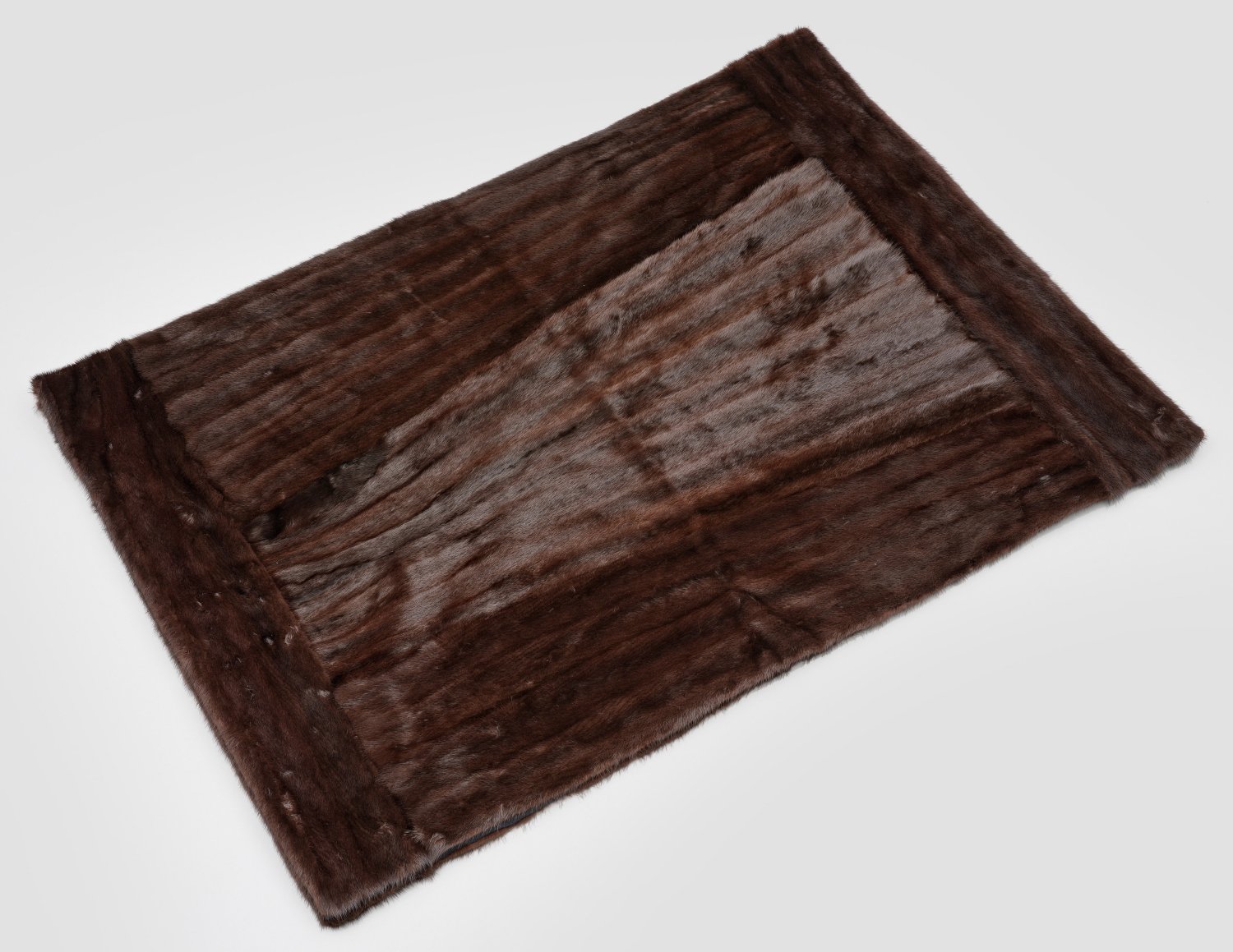 Rechteckige Decke aus dunkelbraunem, in schmalen Bahnen gegenläufig angelegtem Nerz in ausgelassener Verarbeitung. Umlaufend breite, korrespondierende Rahmung. Rückseite aus anthrazitfarbenem Woll-Cashmere. 142 cm x 200 cm.