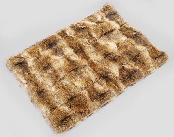 Rechteckige Decke aus beige-braun gemasertem, in Rechtecken angeordnetem Waschbärenfell. Rückseite aus braunem Woll-Cashmere. 136 cm x 195 cm.