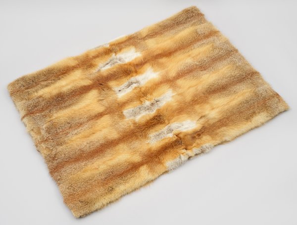 Rechteckige Decke aus hellbraun meliertem, gegeneinander gestelltem Fuchs. Rückseite aus gelber Baumwolle. 202 cm x 138 cm.