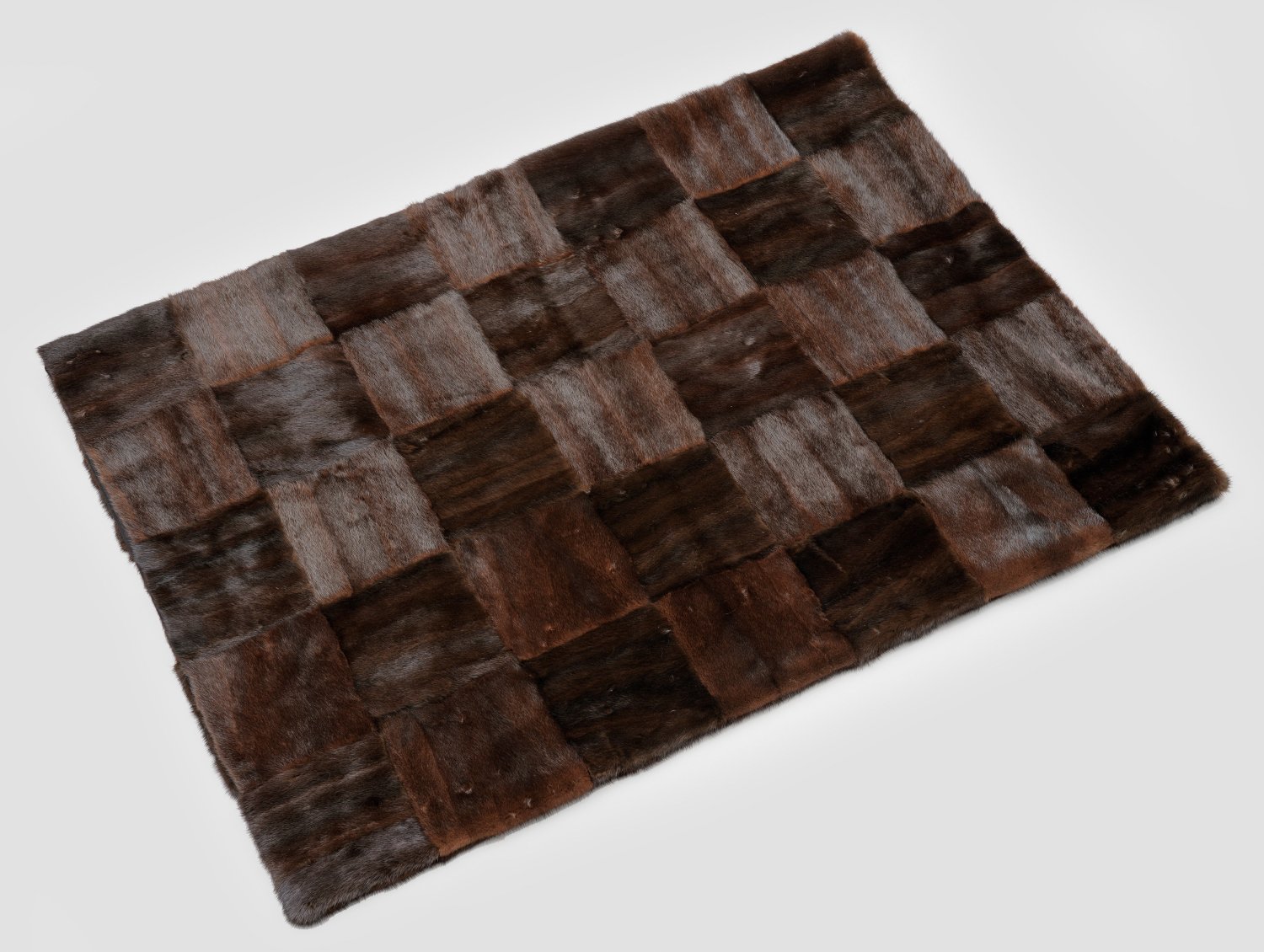 Rechteckige Decke aus dunkelbraunem, im Würfelmuster angeordnetem Nerz in ausgelassener Verarbeitung. Rückseite aus schwarzem Woll-Cashmere. 204 cm x 140 cm.