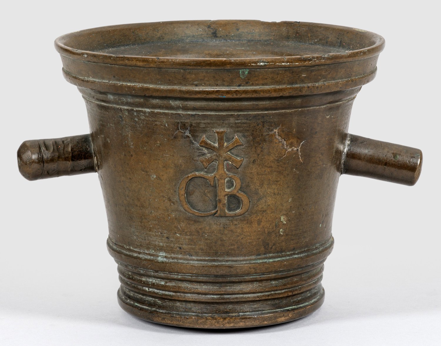 Bronze. Über dem leicht ausgestellten Fuß konisch sich erweiternder, im Ansatz mehrfach profilierter Korpus. Seitlich zwei schräg gegliederte Griffe. Konvex gekanteter, vielfach profilierter Rand. Beidseitig zentrale Initialen "CB" mit Kreuz. H. 22 cm. D. 25 cm.