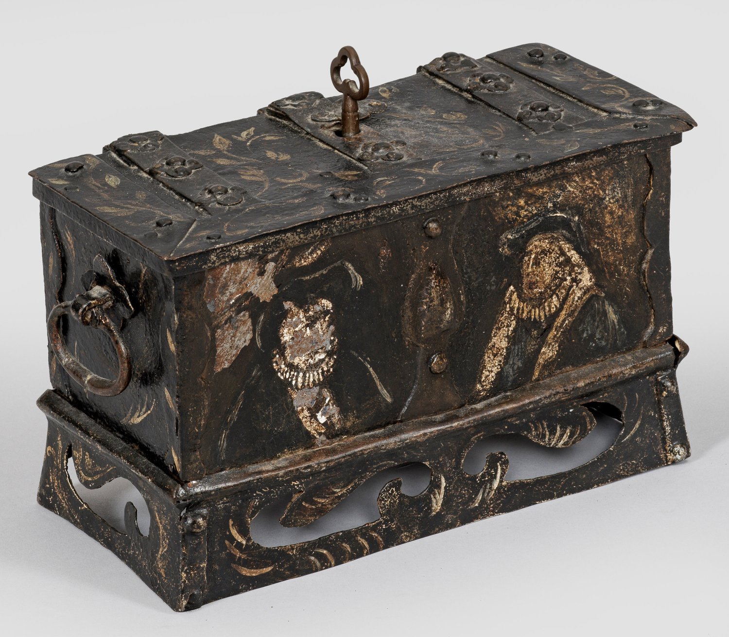 Eisen, bemalt. Volutenförmig durchbrochen gearbeiteter Stand, übergehend in länglich rechteckigen Korpus mit dreifach scharniertem, flachem Deckel, zentral mit verstecktem Schlüsselloch. Deckel und Ecken durch vernietete Bandbeschläge verstärkt. Seitliche Bügelgriffe. Innen durchbrochen gearbeitete, ziselierte Schlossabdeckung und zwei Zuhaltungen. Schauseitige Malerei mit Brustporträts eines Paares in zeitgenössischer Tracht, restliche Wandung, Deckel und Sockel bemalt mit Blättern und Blattranken. Hohldornschlüssel mit Dreipassreide. Minim. rest.; H. 14,5 cm - 23,5 cm. 22 cm x 10 cm.