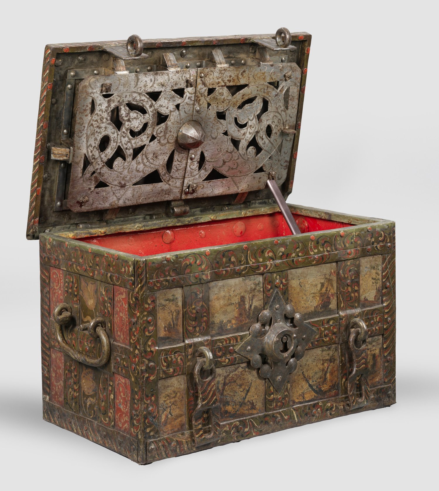 Eisen, geschmiedet und polychrom bemalt. Rechteckiger Korpus mit flachem Scharnierdeckel und seitlichen Tragegriffen sowie teilw. über Kreuz genieteten und geschmiedeten Bändern. Schauseitig der Wandung in den einzelnen Feldern architektur- und personenbestandene Landschaften und Segelboote. Auf dem Deckel und den Schmalseiten Floraldekor. Die Rückseite gänzlich in gräulich-grünfarben, die Innenwandung in Rot gefasst. Schauseite mit zentralem, vorgeblendetem Scheinschloss mit verziertem Schlüsselschild. In der Front zwei Überwürfe. Innen ornamental-tierfigürliche, durchbrochen gearbeitete Schlossabdeckung mit 8 Zuhaltungen. Zwei Schlüssel anbei. H. 38 cm. 60 cm x 37 cm.