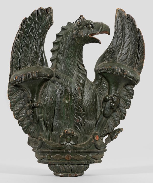 Holz, geschnitzt und grün gefasst. Beidseitig im Relief gearbeitete Darstellung eines Greifs, auf einer Adelskrone sitzend, zuvorderst wohl zwei Rasseln haltend, das Wappentier eines Adelsgeschlechts darstellend. Partiell ber./rest.; H. 46 cm.
