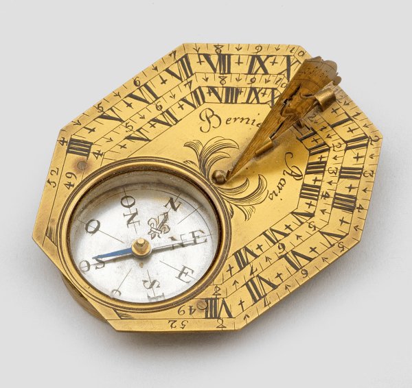 Messing, graviert. Oktogonaler Korpus mit eingelassenem Kompass. Auf der Grundplatte Stundenfolgen in arabischen und lateinischen Ziffern. Mittelachse mit Schattenwerfer und Vogel. Verso Polhöhungen von 18 Städten, von Paris bis Rom. Auf der Platte bez. "Bernier Paris". 6,5 cm x 8 cm.