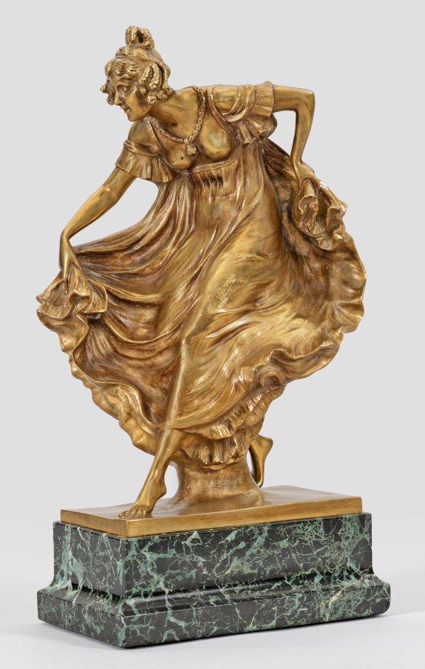 Vergoldete Bronze. Sign.; Gießermarke "RKB". Vollplastische Jugendstil-Tänzerin mit vorgestelltem Bein, mit den Händen das wallende Kleid haltend. Schwarz gemaserter Marmorsockel, rest.; Der Bildhauer, der 1893/94 im Atelier Auguste Rodins in Paris arbeitete und später ein eigenes Atelier in Berlin unterhielt, wurde vor allem durch seine Entwürfe weiblicher Akte bekannt. Ges.-H. 36 cm.